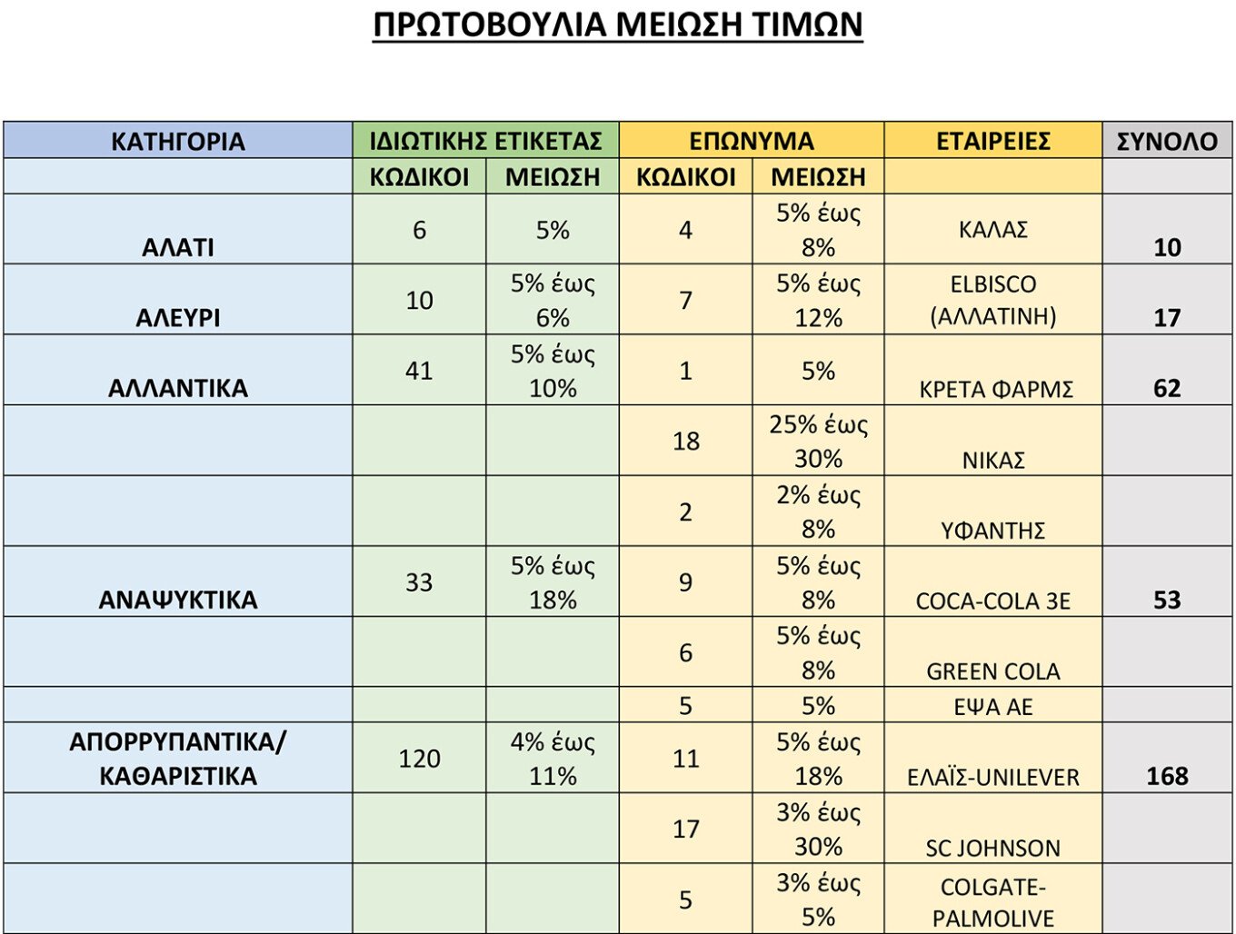 Όπως έγινε γνωστό οι μειώσεις των τιμών σε πρoϊόντα σούπερ μάρκετ ξεκινά από το 3% και φτάνουν σε ορισμένες περιπτώσεις φτάνουν ακόμα και το 35%.