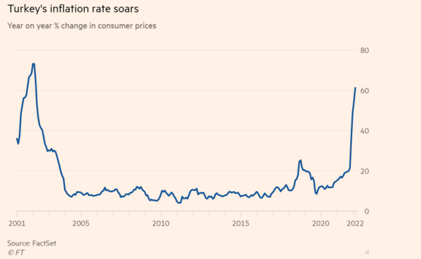 Οι τιμές των τροφίμων αυξήθηκαν κατά 70% σε ετήσια βάση, ενώ το κόστος της ενέργειας εκτινάχθηκε σχεδόν κατά 103%. Ακόμη και πριν από τον πόλεμο στην Ουκρανία, που επιδείνωσε την ενεργειακή κρίση, η Τουρκία ήταν ήδη αντιμέτωπη με τον υψηλότερο πληθωρισμό επί προεδρίας Ρετζέπ Ταγίπ Ερντογάν.