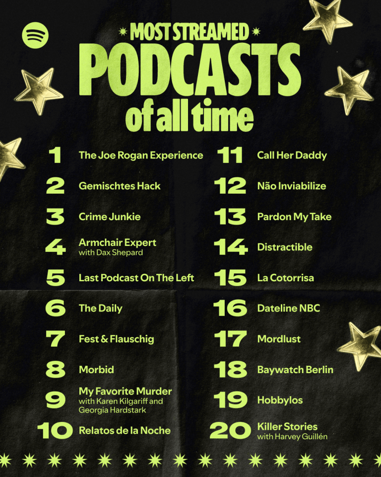 Η Spotify δημοσίευσε επίσης αντίστοιχη λίστα για τα podcasts, με το «The Joe Rogan Experience» να βρίσκεται στην κορυφή.
