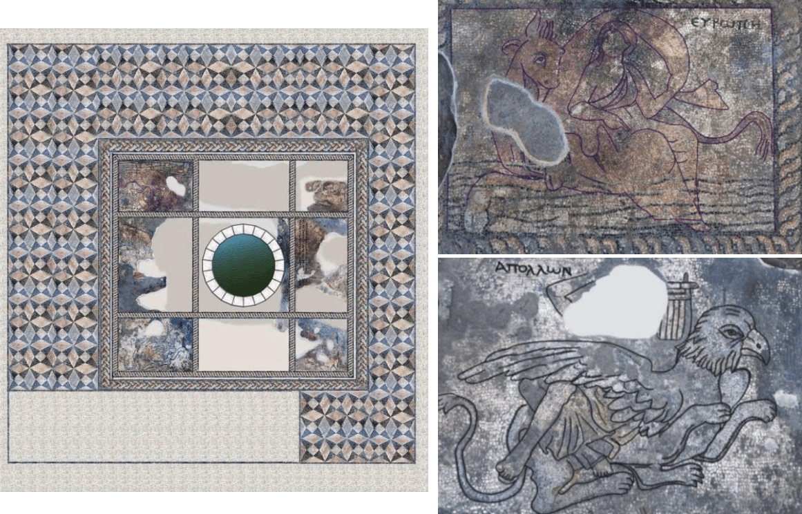 Σχεδιαστική αναπαράσταση ψηφιδωτών δαπέδων αίθουσας και αναπαράσταση Ευρώπης και Απόλλωνα σε διάχωρα της αίθουσας