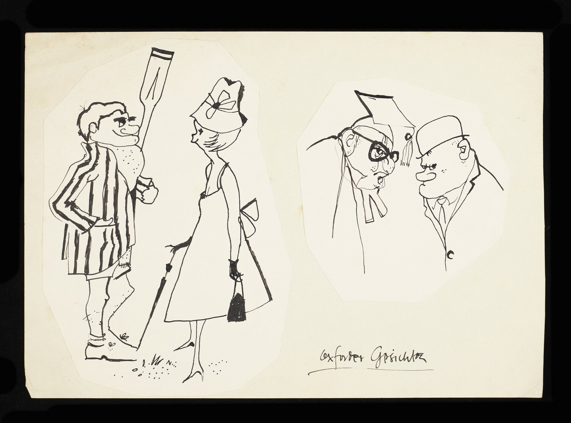 Σκίτσα με πένα και μελάνι με τίτλο «Oxford Gesichte» (Πρόσωπα της Οξφόρδης), περ. 1953. Φωτ.: Αρχείο Τζον Λε Καρέ / Ευγενική παραχώρηση των Βιβλιοθηκών Bodleian