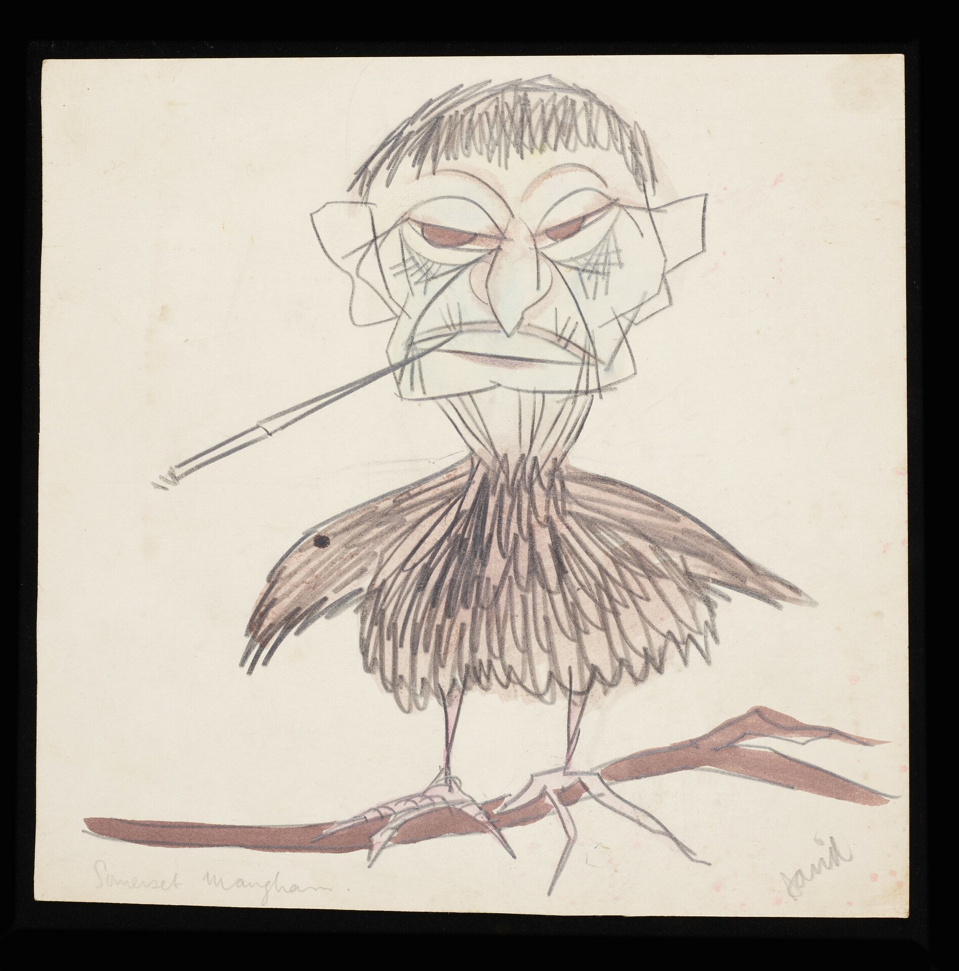 Σχέδιο κουκουβάγιας με ανθρώπινο κεφάλι, με τίτλο Somerset Maugham, υπογεγραμμένο από τον Τζον Λε Καρέ . Φωτ.: Αρχείο John Le Carré
