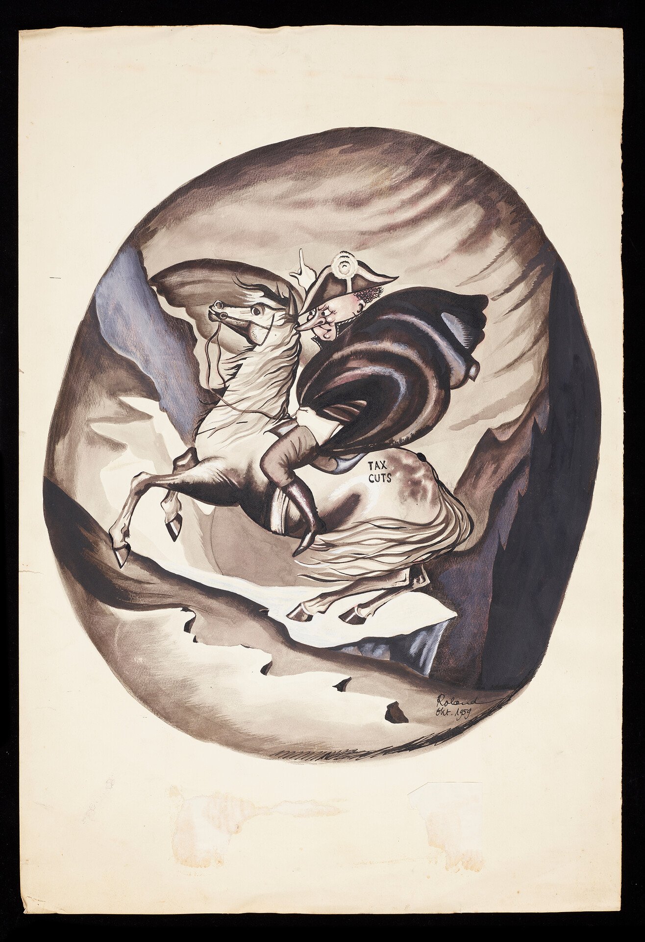 Σχέδιο του Λε Καρέ με τίτλο «Tax cuts» (Μειώσεις φόρων), υπογεγραμμένη από τον Ρόλαντ – ένα άλλο ψευδώνυμο που χρησιμοποιούσε στις εικονογραφήσεις του.