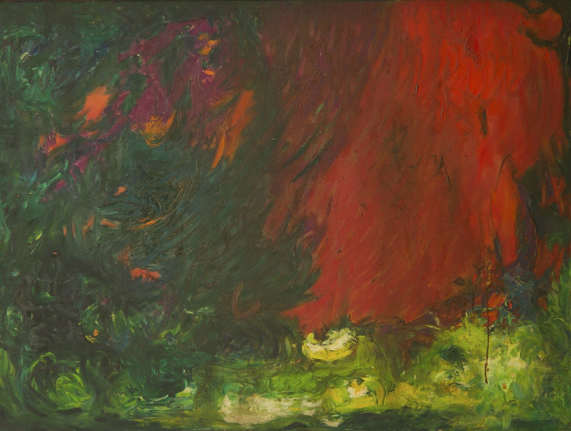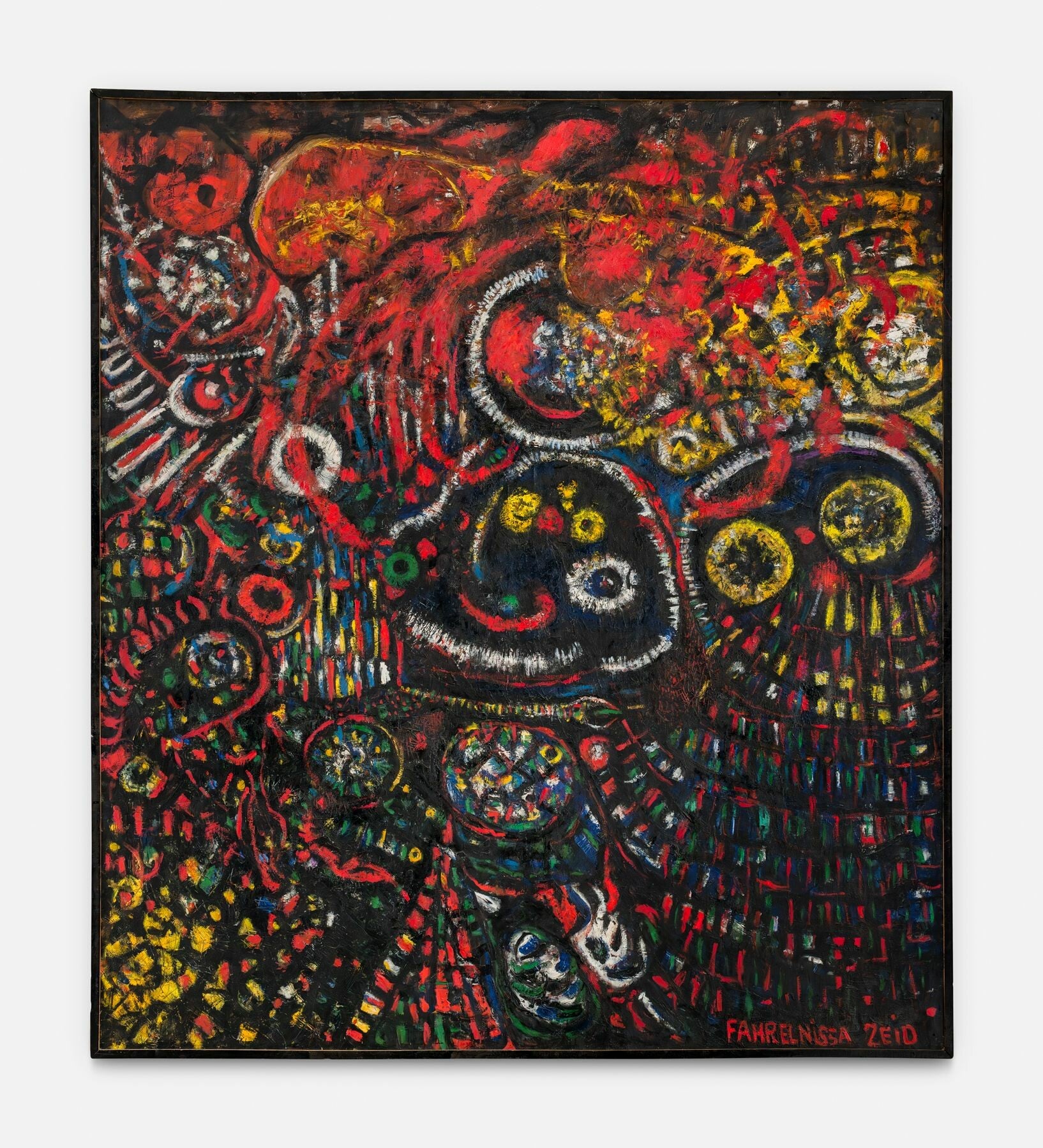 Από εκεί και πέρα, οι μεγάλοι της πίνακες μοιάζουν συχνά με μωσαϊκά που έχουν πάρει φωτιά. Μαύρες γραμμές, σαν μολυβένια νεύρα, συγκρατούν επιφάνειες που αλλιώς θα διαλύονταν. Χρώματα που θυμίζουν βιτρό, ψηφιδωτό ή οργανικό σώμα συνυπάρχουν μέσα στο ίδιο κάδρο. Η Ζεΐντ δεν ήταν ποτέ μια «ψυχρή» αφηρημένη ζωγράφος. Η αφαίρεσή της είχε πάντα κάτι σωματικό, αρχιτεκτονικό και πνευματικό. Γι’ αυτό και έργα όπως το My Hell ή το Resolved Problems δεν διαβάζονται ως ασκήσεις μορφής, αλλά ως πεδία έντασης που αρνούνται να σταθούν ήσυχα στον τοίχο.