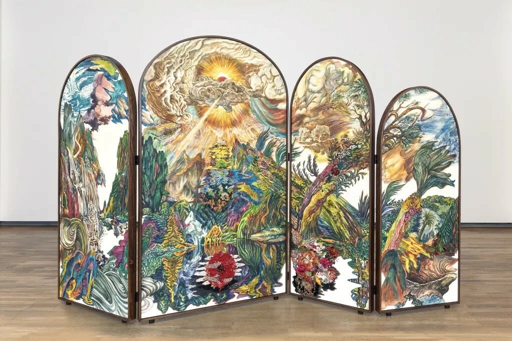 Το Wallpaper υπογραμμίζει την εκρηκτική χρωματική ένταση και τις πυκνά διακοσμημένες επιφάνειες που χαρακτηρίζουν το έργο του: καμβάδες εμπλουτισμένοι με κέντημα, χάντρες και χειροποίητα υλικά, καθώς και ένα μνημειακό, διπλής όψης πτυσσόμενο παραβάν, εμπνευσμένο από τις παραδόσεις των ιαπωνικών byōbu και κορεατικών byeongpung. Από τη μία πλευρά, ένα καλειδοσκοπικό τοπίο κορεσμένου χρώματος· από την άλλη, μια σχεδόν μονοχρωματική εικόνα δέντρου. Η αντίθεση είναι μεθοδική.