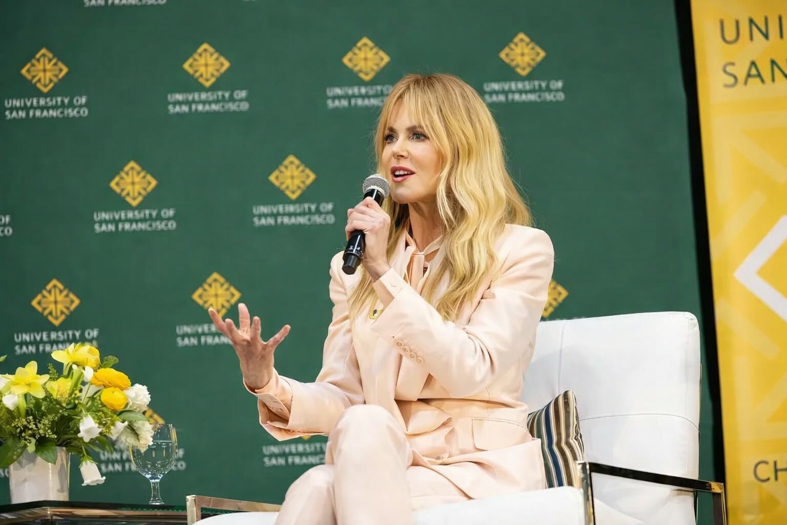 Η Νικόλ Κίντμαν μιλά στη σκηνή του War Memorial Gym, στην πανεπιστημιούπολη του Πανεπιστημίου του Σαν Φρανσίσκο, στο πλαίσιο της σειράς εκδηλώσεων Silk Speaker Series, στις 11 Απριλίου 2026. Φωτογραφία: Πανεπιστήμιο του Σαν Φρανσίσκο