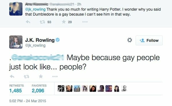 «Αναρωτιέμαι γιατί είπατε ότι ο Ντάμπλντορ είναι ομοφυλόφιλος, εγώ δεν μπορώ να τον φανταστώ έτσι», έγραψε η Ana K. στο Twitter απευθυνόμενη στη συγγραφέα για να λάβει την εξής απάντηση: «Ίσως επειδή οι γκέι άνθρωποι απλά μοιάζουν... άνθρωποι;"