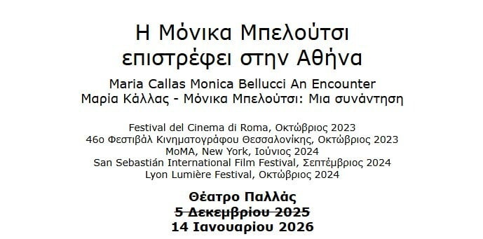 Ο πολιτιστικός οργανισμός Λυκόφως ενημέρωσε το κοινό ότι λόγω των δυσμενών καιρικών συνθηκών και για την ασφάλεια των θεατών, αναβάλλεται η σημερινή προβολή της ταινίας «Maria Callas Monica Bellucci: An Encounter / Μαρία Κάλλας - Μόνικα Μπελούτσι: Μια συνάντηση», παρουσία της Μόνικα Μπελούτσι στο Θέατρο Παλλάς.