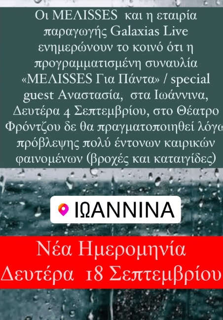 Στα Ιωάννινα αναβάλλεται η συναυλία του Χρήστου Μάστορα και της Αναστασίας για τις 18 Σεπτεμβρίου. «Οι Μέλισσες και η εταιρεία παραγωγής ενημερώνουν το κοινό ότι την προγραμματισμένη συναυλία MELISSES Για Πάντα / special guest Αναστασία, στα Ιωάννινα Δευτέρα 4 Σεπτεμβρίου στο θέατρο Φρόντζου δεν θα πραγματοποιηθεί λόγω προβλέψεις πολύ έντονων καιρικών φαινομένων (βροχές και καταιγίδες)», αναφέρουν σε ανάρτησής τους.