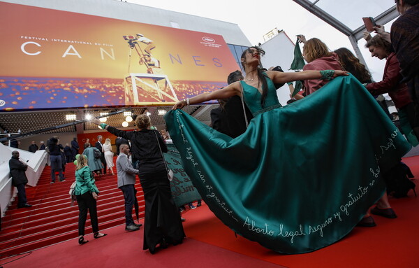 Δεκάδες γυναίκες φώναξαν συνθήματα για το δικαίωμα στην άμβλωση στο κόκκινο χαλί στο Φεστιβάλ Κινηματογράφου των Καννών στη Γαλλία.
