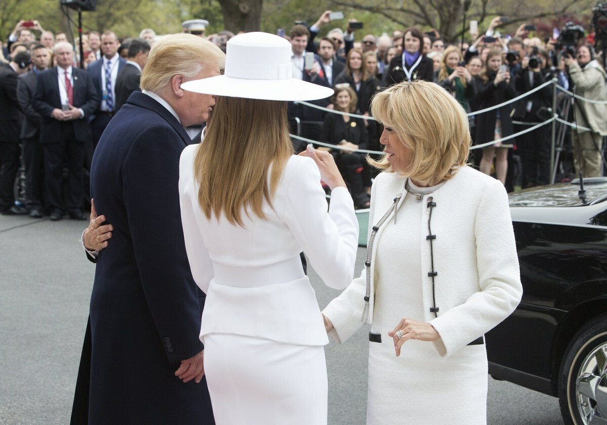 Για να υποδεχτεί στον Λευκό Οίκο τους επίσημους καλεσμένους της, η Μελάνια επέλεξε τη διαχρονική κομψότητα ενός μαύρου φορέματος σε ίσια γραμμή του οίκου Dolce & Gabbana το οποίο συνδύασε με μαύρη κάπα του γαλλικού οίκου Givenchy. Απέναντι της, η Μπριζίτ Μακρόν, πιστή στον οίκο Vuitton, διάλεξε ένα σύνολο --φόρεμα και μαντό-- στο χρώμα της σαμπάνιας, με ασύμμετρη μαύρη λεπτή ζώνη που έδενε με φιόγκο.