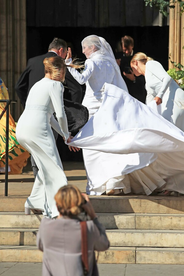 Με ένα vintage Volkswagen έφτασε στην εκκλησία νωρίς το μεσημέρι η νύφη, η οποία έγινε δεκτή με χειροκρότημα καθώς εκατοντάδες φανς είχαν στριμωχτεί πίσω από τα κάγκελα για να δουν από κοντά το ζευγάρι, αλλά και τις αφίξεις των διάσημων καλεσμένων.