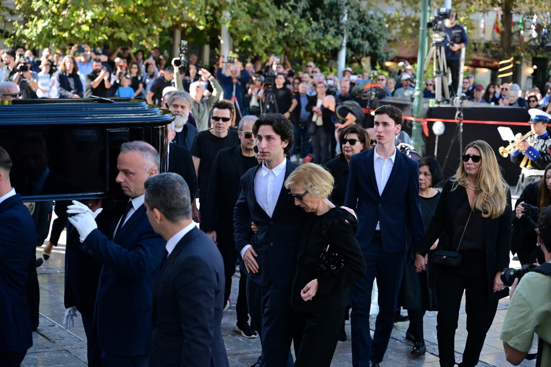 Από νωρίς το πρωί, το παρεκκλήσι της Μητρόπολης Αθηνών πλημμύρισε από όσους μυήθηκαν στο «περιβόλι του τρελού». Καλλιτέχνες, πολιτικοί, αλλά και πολίτες στάθηκαν σιωπηλοί μπροστά στη σορό του, αποτίοντας φόρο τιμής σε έναν δημιουργό που, με το έργο του, κατόρθωσε να ενώσει γενιές και διαφορετικές Ελλάδες.