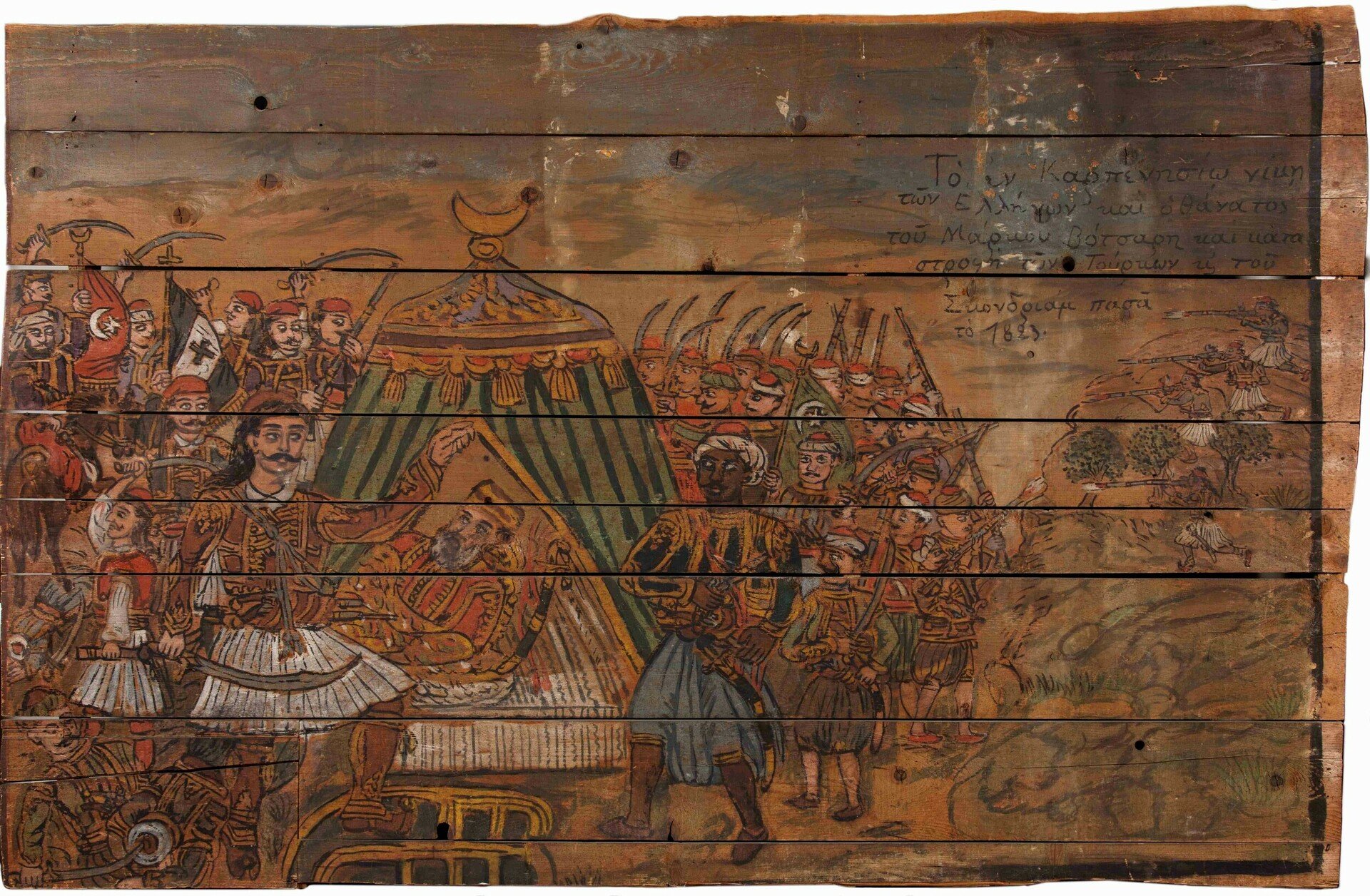 Μεγάλο ενδιαφέρον αναμένεται να προκαλέσει και το μνημειακό έργο του Θεόφιλου Χατζημιχαήλ, «Η νίκη των Ελλήνων στο Καρπενήσι και ο θάνατος του Μάρκου Μπότσαρη» (€120.000–180.000), στο οποίο ο λαϊκός ζωγράφος υμνεί το ηρωικό πνεύμα της Επανάστασης του 1821 με τη χαρακτηριστική του αυθεντικότητα και αφηγηματική δύναμη.