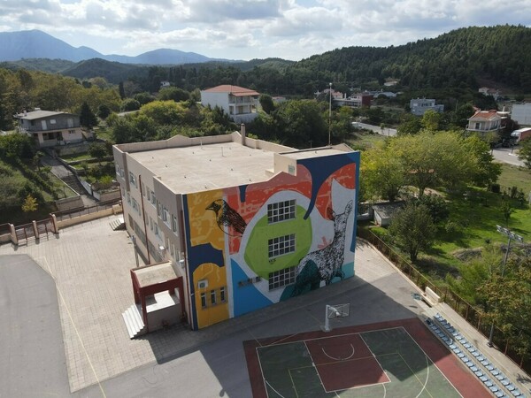 Η παρούσα τοιχογραφία υλοποιήθηκε στο δημοτικό σχολείο στο Δήμο Μαντουδίου και δημιουργός του έργου είναι ο Κez.