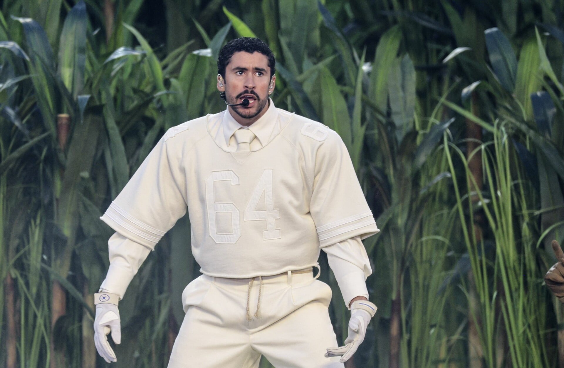 Ο πρωταγωνιστής της βραδιάς εμφανίστηκε στη σκηνή με ένα κομψό, ολόλευκο custom σύνολο από τη Zara, ολοκληρωμένο με αξεσουάρ την πορτορικανική σημαία. Το look, επιμελημένο από τους σταθερούς του συνεργάτες Storm Pablo και Marvin Douglas Linares, αποτελούνταν από ένα φαρδύ φούτερ εμπνευσμένο από φανέλα του αμερικανικού ποδοσφαίρου, φορεμένο πάνω από πουκάμισο με γιακά, σε συνδυασμό με ασορτί chino παντελόνι, γραβάτα, γάντια και sneakers.