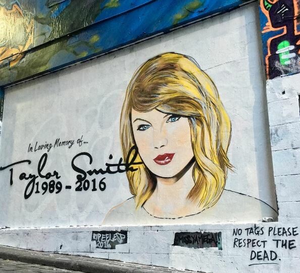 Το τελευταίο του mural δεν περιέχει καθόλου γυμνό. Ωστόσο κάνει από το πρωί τον γύρο των media. Κι αυτό γιατί αφορά την Taylor Swift και όπως διευκρινίζει ο ίδιος είναι ένα mural "στη μνήμη" της διάσημης τραγουδίστριας για τον μεταφορικό "θάνατό" της.