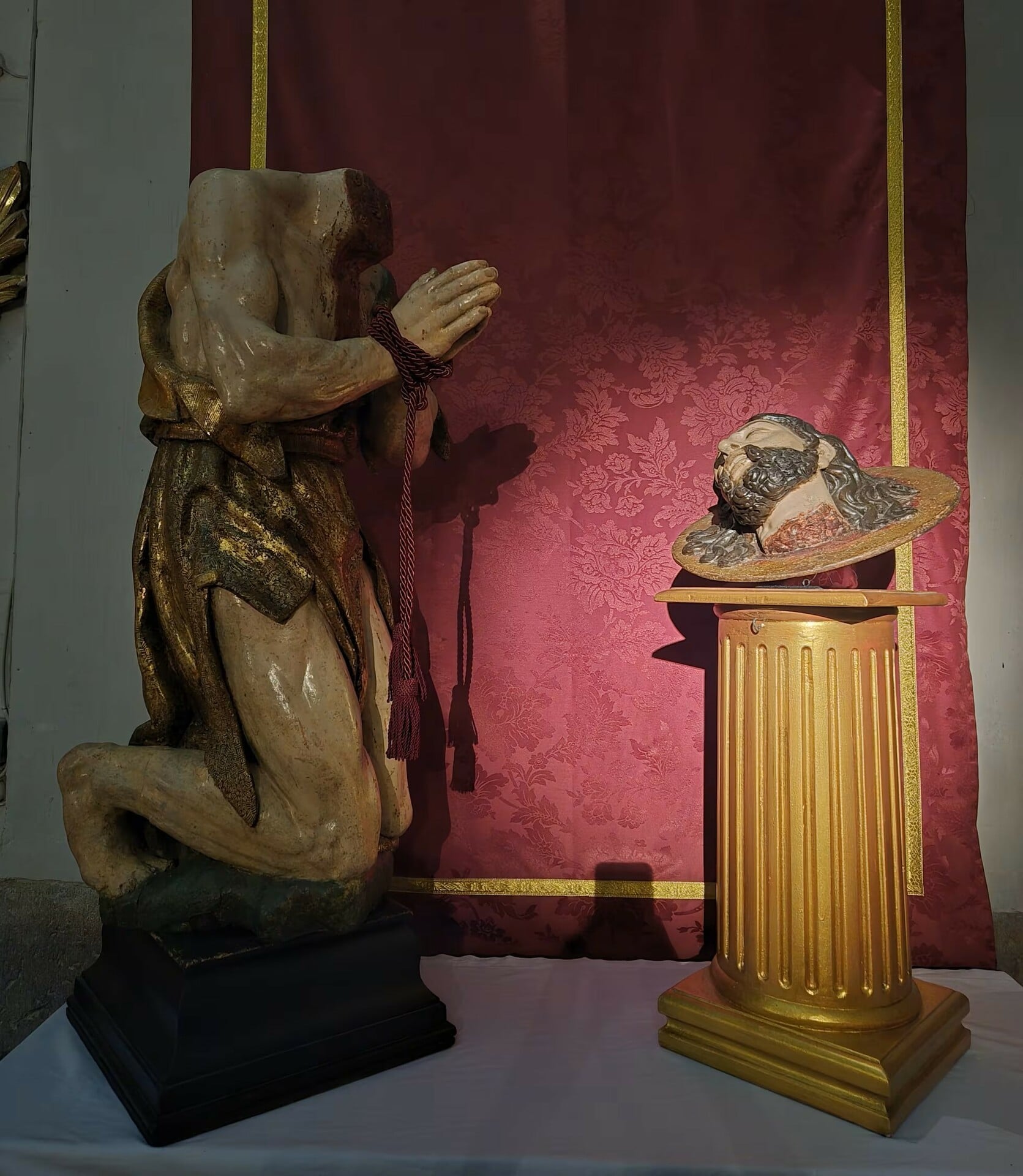Ανάμεσα στα έργα που ξεχωρίζουν είναι γλυπτά του 16ου αιώνα που παρουσιάζουν τη μορφή του Θανάτου ως σώμα σε αποσύνθεση, αλλά και μπαρόκ απεικονίσεις μαρτυρίων, όπου κεφάλια αγίων τοποθετούνται σε βάθρα με ανατριχιαστική λεπτομέρεια.
