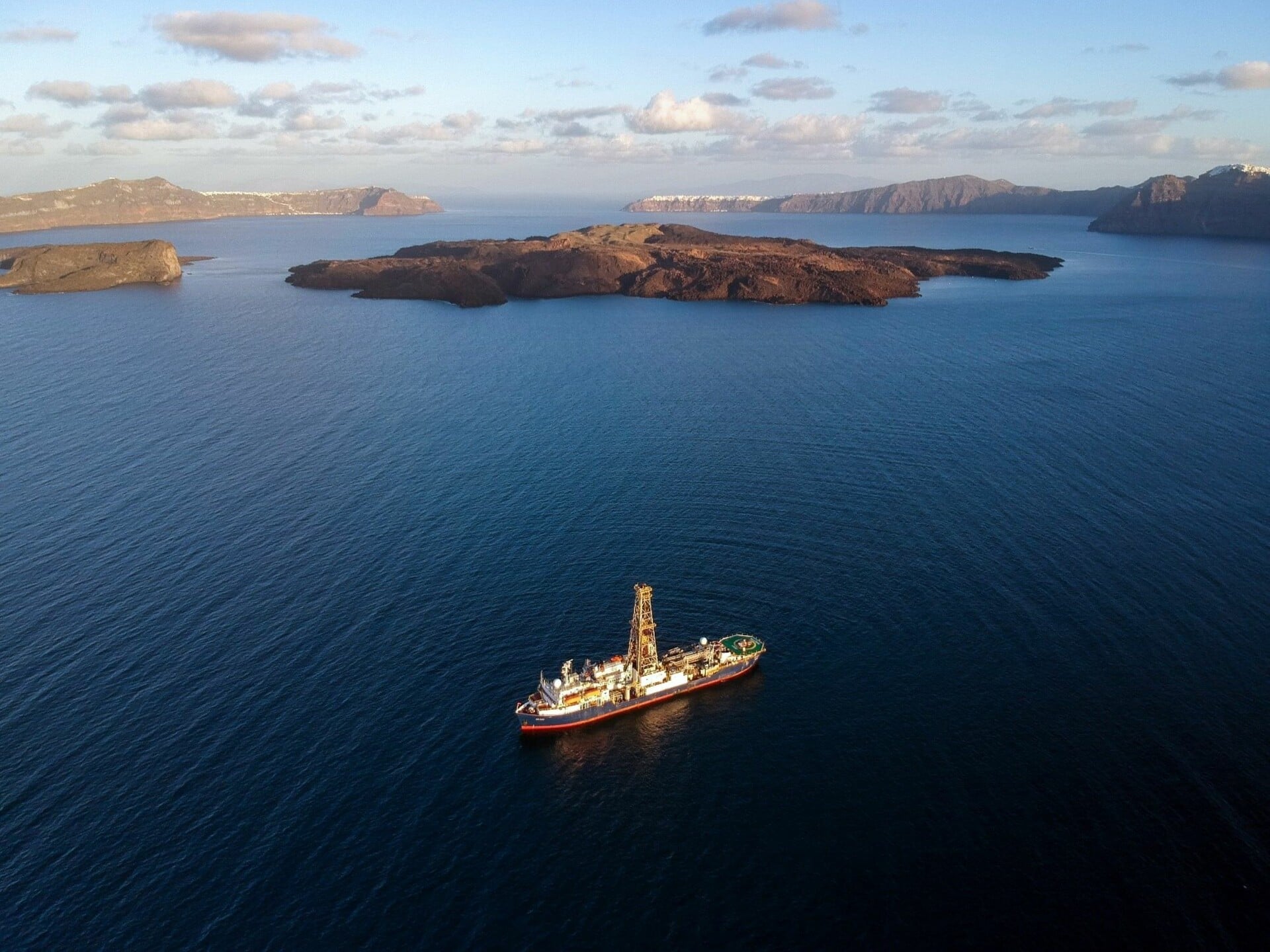 Το ερευνητικό σκάφος JOIDES στην καλδέρα της Σαντορίνης, με φόντο το ηφαίστειο της Νέας Καμένης / Φωτ: Thomas Ronge, JRSO IODP