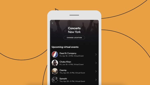 Το Spotify, ενημερώνει πλέον τους χρήστες της για συναυλίες εξ αποστάσεως και άλλα εικονικά μουσικά event στον κυβερνοχώρο, κλείνοντας συνεργασίες με διοργανωτές τέτοιων εκδηλώσεων που φιλοξενούν μουσικούς, των οποίων η δισκογραφία περιλαμβάνεται στις βάσεις δεδομένων της συνδρομητικής πλατφόρμας.