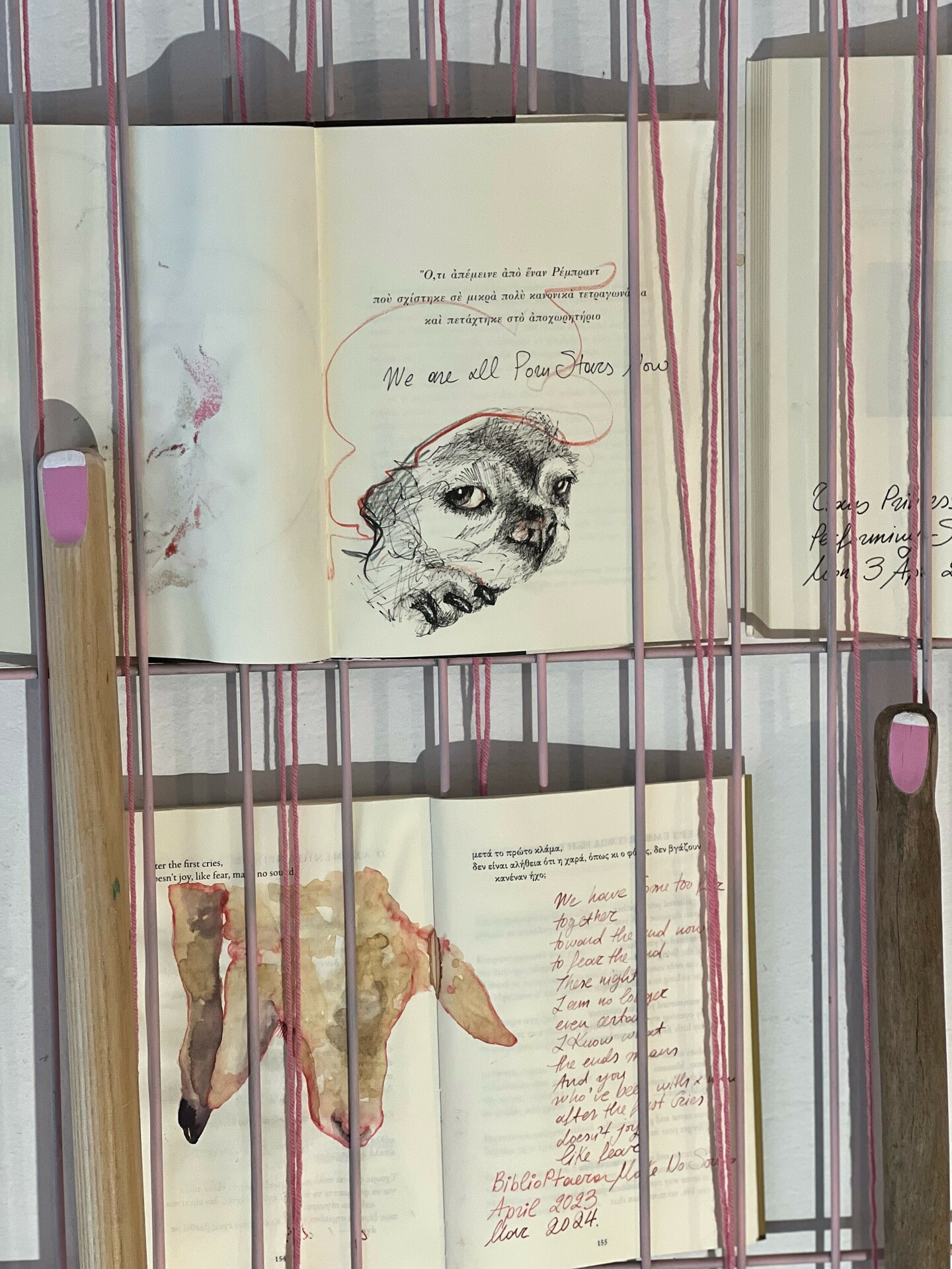 Αναπαραγωγές ολόκληρων κειμένων, αποδομημένες, κατακερματισμένες φράσεις, θραύσματα λέξεων αλλά και ολόκληρα βιβλία και περιοδικά διεισδύουν στις εικαστικές συνθέσεις. Όπου δεν υπάρχει γραφή, και όχι μόνο, τα έργα απαρτίζονται από πολλές επαναλαμβανόμενες μονάδες, όμοιες και διαφορετικές. Λειτουργούν σαν λέξεις που συγκροτούν φράσεις, σχηματοποιώντας κωδικοποιημένες οπτικές βιογραφίες θηλυκοτήτων. Η ιδέα της συνέχειας και του απείρου επικρατεί δομικά και εννοιολογικά σε αυτά τα έργα ως διττή συμβολική νύξη. Αναφορά στην κατά συρροή έμφυλη κακοποίηση ή στην ιερή ιδιαιτερότητα των γυναικών να δημιουργούν νέα ζωή.