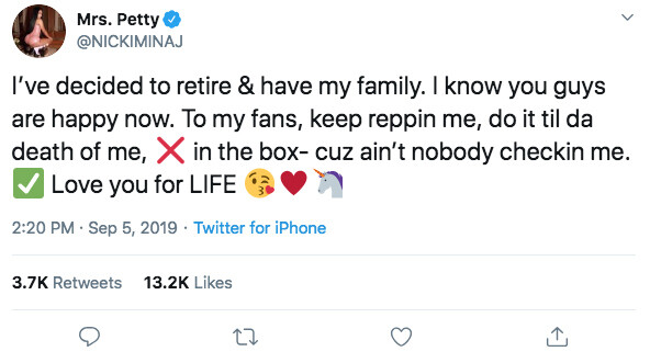 Η 36χρονη τραγουδίστρια, ηθοποιός και μοντέλο, γνωστή για το προκλητικό στιλ της και τα τραγούδια της όπως το Anaconda, είναι αρραβωνιασμένη με το στέλεχος της αμερικανικής μουσικής βιομηχανίας, τον Κένεθ Πίτι. O ισχυρισμός πως αποσύρεται για να αφοσιωθεί και να αποκτήσει οικογένεια έγινε με ένα tweet και σόκαρε τους θαυμαστές που αντιδρούν μαζικά με μηνύματα στα social media.