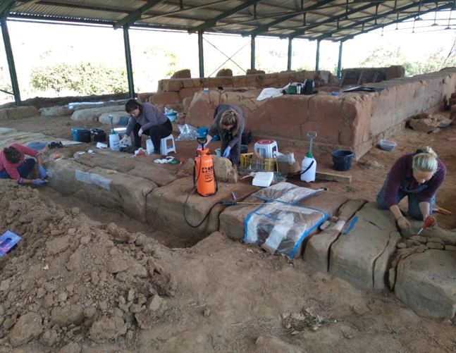 Στη μελέτη συντήρησης εξετάζονται κυρίως τα εσωτερικά κατάλοιπα του ναού από ψαμμίτη και από ωμοπλίνθους. Η κατάσταση διατήρησης του λατρευτικού βάθρου κρίνεται κάκιστη, καθώς παρουσιάζει εκτεταμένες θραύσεις και κατακερματισμό του δομικού υλικού. Το λατρευτικό βάθρο προγραμματίζεται να συντηρηθεί συνολικά με την η αναθηματική στήλη. Ο ωμοπλίνθινος διαχωριστικός τοίχος και τα θρανία παρουσιάζουν μεγάλη απώλεια υλικού και μεγάλο κίνδυνο ετοιμορροπίας και διάλυσης. Για το λόγο αυτό προτείνονται καθαρισμός επιφανειών, σφράγιση ρωγμών και διερεύνηση της δυνατότητας για ήπια στερεωτική επέμβαση.