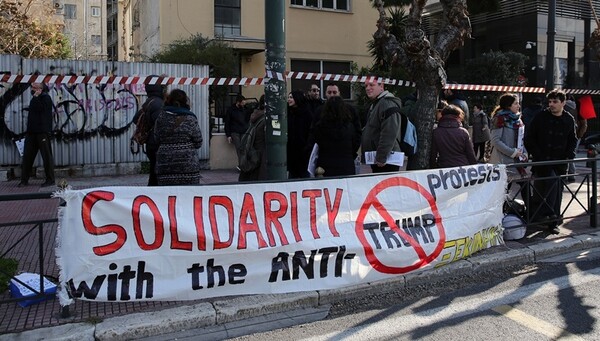 Εξάλλου στη μία το μεσημέρι συγκέντρωση διαμαρτυρίας εναντίον της ανάληψης της προεδρίας των ΗΠΑ από τον Ντόναλντ Τραμπ, πραγματοποίησαν έξω από την αμερικάνικη πρεσβεία οργανώσεις και κινηματικές συλλογικότητες από τον χώρο της Αριστεράς, του αντιφασισμού-αντιρατσισμού και των κοινωνικών και πολιτικών δικαιωμάτων, που ανάρτησαν πανό και πλακάτ κατά του νεοεκλεγέντος Αμερικανού προέδρου. Η συγκέντρωση επρόκειτο να πραγματοποιηθεί ακριβώς μπροστά στην πρεσβεία, ωστόσο η πρόσβαση αποκλείστηκε νωρίς από δυνάμεις της αστυνομίας, η οποία παρέταξε εννέα κλούβες των ΜΑΤ, τη μία πίσω από την άλλη κατά μήκος του κτιρίου.