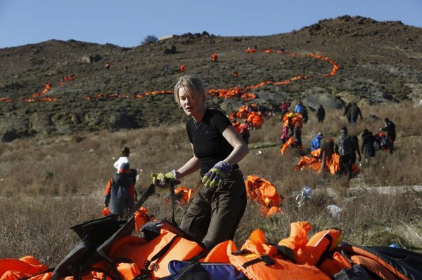 Σχεδόν 3000 πορτοκαλί σωσίβια, τα σύμβολα των προσφύγων που στοιβάζονται καθημερινά στο νησί, χρησιμοποιήθηκαν για να σχηματίσουν το σύμβολο της ειρήνης στους λόφους της Λέσβου.