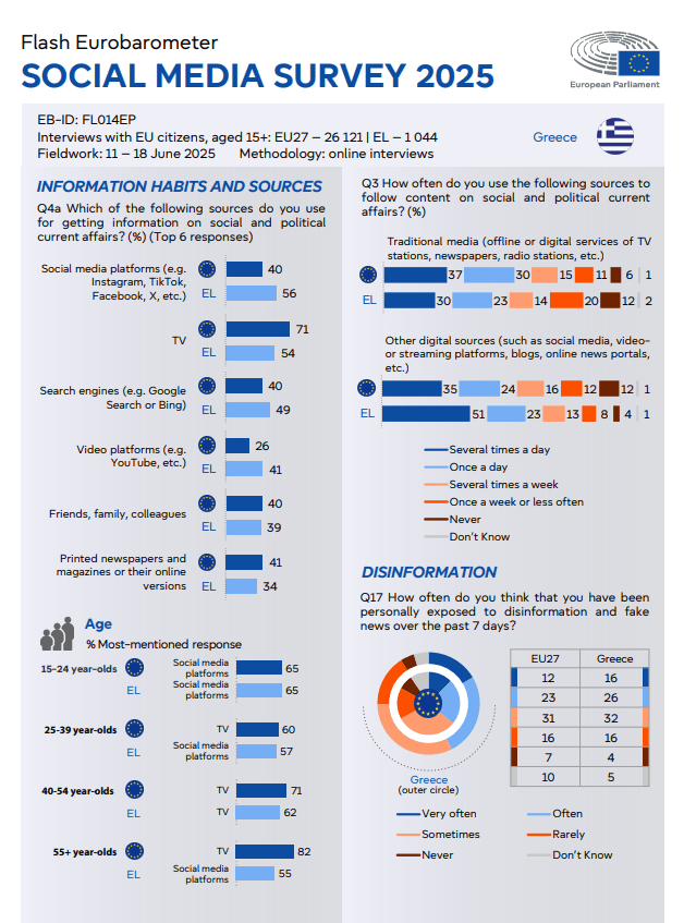 Περισσότεροι από τους μισούς Έλληνες πολίτες αντλούν πλέον την ενημέρωσή τους για κοινωνικά και πολιτικά θέματα από τα μέσα κοινωνικής δικτύωσης, σύμφωνα με την έρευνα Flash Eurobarometer 2025 του Ευρωπαϊκού Κοινοβουλίου.