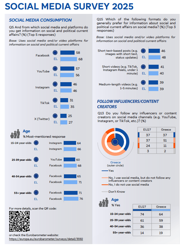 Συγκεκριμένα, το 56% των Ελλήνων δηλώνει ότι χρησιμοποιεί πλατφόρμες όπως Facebook, Instagram, TikTok ή X (Twitter) για την ενημέρωσή του — ποσοστό υψηλότερο από τον ευρωπαϊκό μέσο όρο (40%).