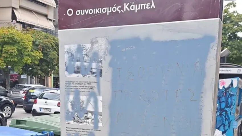 Άγνωστοι βανδάλισαν τη στήλη μνήμης του εβραϊκού συνοικισμού «Καμπέλ» στην περιοχή του Βότση, στον δήμο Καλαμαριάς Θεσσαλονίκης. Οι δράστες μουτζούρωσαν τη στήλη με σπρέι και έγραψαν πάνω της διάφορα συνθήματα.