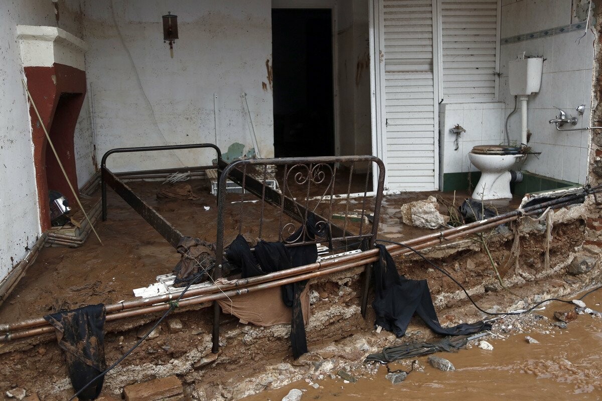 Τα γραφεία της τοπικής οργάνωσης της Νέας Δημοκρατίας κατεστραμμένa μετά τις καταρρακτώδεις βροχές. (ΑΠΕ- ΜΠΕ/ ΓΙΑΝΝΗΣ ΚΟΛΕΣΙΔΗΣ)