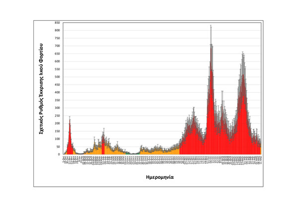 Όπως φαίνεται στα επισυναπτόμενα διαγράμματα που παρουσιάζει το ΑΠΕ-ΜΠΕ, το ιικό φορτίο των λυμάτων μετριόταν σε αντίστοιχο επίπεδο το δεύτερο δεκαήμερο του Οκτωβρίου 2021 οπότε ανέβηκε στο κόκκινο όπου και παρέμεινε, με έντονες περιοδικές εξάρσεις, που είχαν αποτυπωθεί και σε πολύ υψηλό αριθμό ημερήσιων ανακοινωμένων κρουσμάτων.