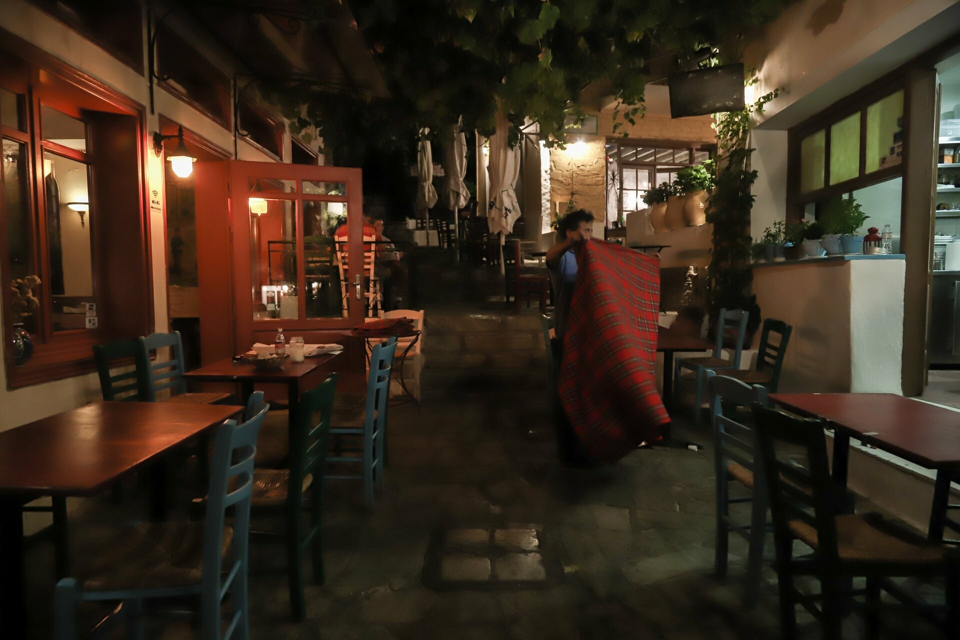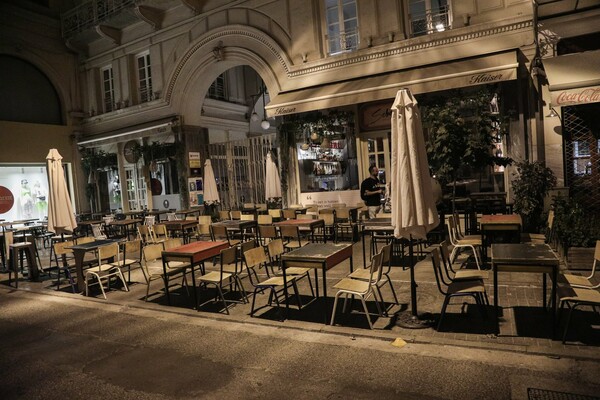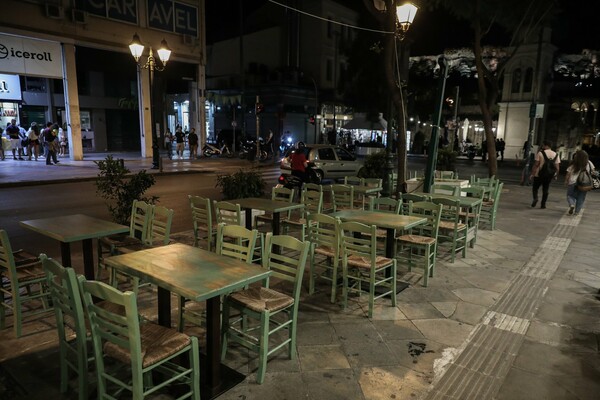 Στις φωτογραφίες που έδωσε στη δημοσιότητα το πρακτορείο Eurokinissi αποτυπώνονται τα καταστήματα, άδεια από πελάτες, με το προσωπικό να μαζεύει τα τραπεζοκαθίσματα.