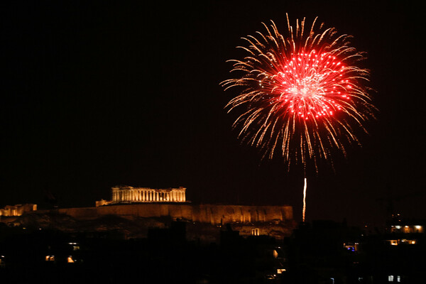 Πολύχρωμα βεγγαλικά φώτισαν τη νύχτα με τις αποχρώσεις τους να αντανακλώνται αχνά στον ιερό βράχο της Ακρόπολης. Στον Πειραιά, ο Πύργος άλλαζε χρώματα το λιμάνι δέχθηκε λίγο αργότερα το πρώτο πλοίο της χρονιάς.