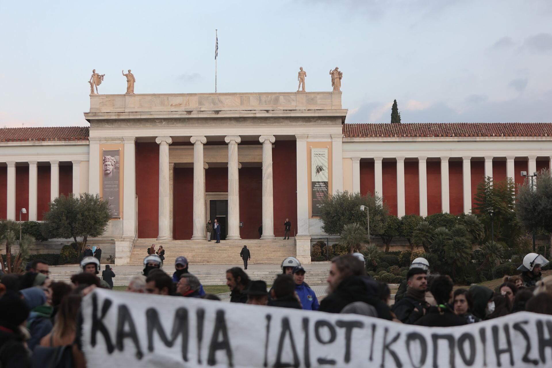 Σε συγκέντρωση διαμαρτυρίας έξω από το Εθνικό Αρχαιολογικό Μουσείο προχωρούν τα μέλη του Συλλόγου Ελλήνων Αρχαιολόγων διαμαρτυρόμενοι για το νομοσχέδιο για τη μετατροπή πέντε μεγάλων μουσείων σε νομικά πρόσωπα δημοσίου δικαίου.