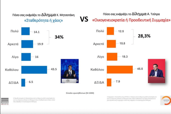 Προβάδισμα 7,5 μονάδων καταγράφει η ΝΔ έναντι του ΣΥΡΙΖΑ- στην πρόθεση ψήφου με αναγωγή επί των έγκυρων- σε δημοσκόπηση της MRB.