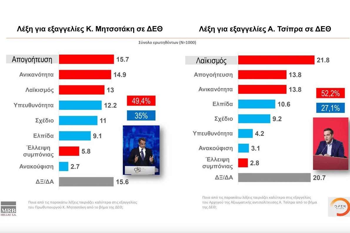 Στην ερώτηση ποια λέξη ταιριάζει καλύτερα στις εξαγγελίες του πρωθυπουργού από τη ΔΕΘ, το 15,7% απάντησε «απογοήτευση» και το 14,9% «ανικανότητα». Στο ίδιο ερώτημα για τον αρχηγό της αξιωματικής αντιπολίτευσης, το 21,8% απάντησε «λαϊκισμός», το 13,8% «απογοήτευση», ενώ το ίδιο ποσοστό συγκέντρωσε η απάντηση «ανικανότητα». Στο ερώτημα για τον καταλληλότερο πρωθυπουργό, ο Κυριάκος Μητσοτάκης συγκέντρωσε το 38,9% και ο Αλέξης Τσίπρας το 29%.