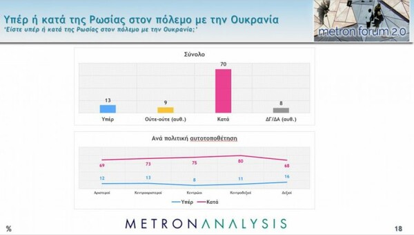 Όπως δείχνει η δημοσκόπηση, η πλειοψηφία των ερωτηθέντων, ποσοστό 70%, είναι κατά της Ρωσίας στον πόλεμο με την Ουκρανία και το 13% υπέρ. Αναφορικά με την αποστολή πολεμικού υλικού στην Ουκρανία, το 66% διαφωνεί και το 29% συμφωνεί με την απόφαση αυτή.