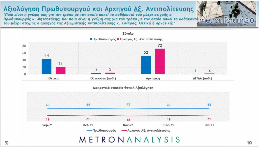 Στο ερώτημα για το πώς κρίνετε το έργο της κυβέρνησης η αποτίμηση είναι 40% θετική έναντι του 54% που την κρίνει αρνητική. Αντίστοιχα για τον ΣΥΡΙΖΑ, θετική άποψη έχει το 16% έναντι του 76%, που είναι αρνητική.