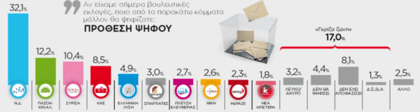 Στη δημοσκόπηση της Palmos Analysis η ΝΔ στην πρόθεση ψήφου συγκέντρωσε ποσοστό 32,1%, έναντι 12,2% του ΠΑΣΟΚ-ΚΙΝΑΛ. Στην τρίτη θέση ακολουθεί ο ΣΥΡΙΖΑ με 10,4% ενώ όσον αφορά στα υπόλοιπα κόμματα, το ΚΚΕ συγκέντρωσε 8,5%, η Ελληνική Λύση 4,9% και οι «Σπαρτιάτες» 3%. Όλα τα άλλα κόμματα δεν συγκεντρώνουν ποσοστά που θα τους επέτρεπαν την είσοδο στη Βουλή, με την «Πλεύση Ελευθερίας» να φτάνει στο 2,7%, τη «Νίκη» στο 2,6%, το ΜέΡΑ25 στο 2,3% και τη «Νέα Αριστερά» στο 1,8%. Οι αναποφάσιστοι φτάνουν στο 8,1%.