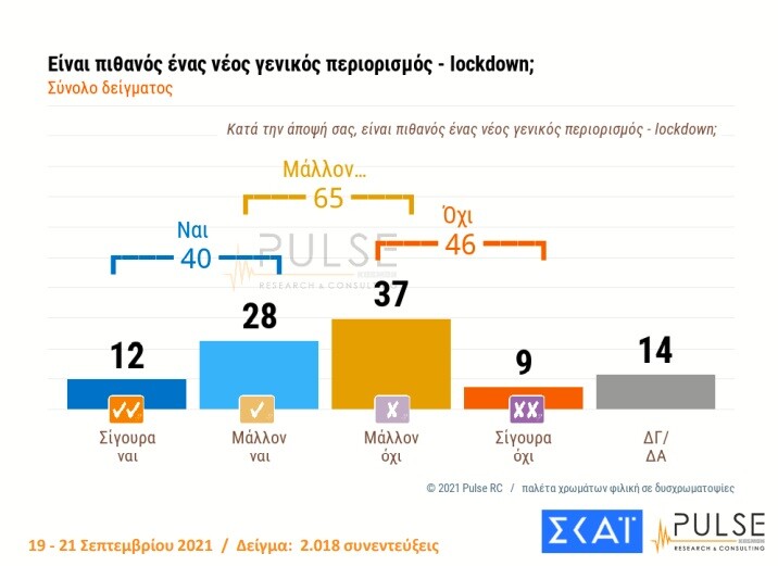 Στο ερώτημα για το πόσο πιθανό θεωρούν το ενδεχόμενο ενός νέου lockdown, τέσσερις στους δέκα ερωτηθέντες εκτιμούν ότι είναι βέβαιο ή μάλλον θα συμβεί, ενώ η πλειονότητα δεν βλέπει να υλοποιείται ένα τέτοιο ενδεχόμενο. Αναλυτικότερα, ποσοστό 12% εικάζει ότι σίγουρα θα προχωρήσουμε σε γενικό lockdown, 28% ότι μάλλον θα συμβεί, ενώ το 46% συνολικά θεωρεί ότι μάλλον δε θα συμβεί κάτι τέτοιο (37% μάλλον όχι/ 9% σίγουρα δε θα συμβεί ). Ποσοστό 14% των ερωτηθέντων δηλώνει δεν ξέρω/δεν απαντώ.