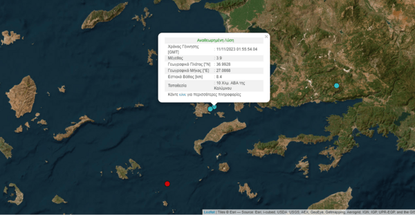 Δύο λεπτά αργότερα, στις 03:55 σημειώθηκε νέος, πιο ισχυρός σεισμός, μεγέθους 3,9 Ρίχτερ. Το εστιακό βάθος ήταν 8,4 χλμ. και το επίκεντρο 10 χιλιόμετρα ανατολικά- βορειοανατολικά της Καλύμνου, σύμφωνα με τα στοιχεία που έδωσε στη δημοσιότητα το Γεωδυναμικό Ινστιτούτο του Εθνικού Αστεροσκοπείου Αθηνών.
