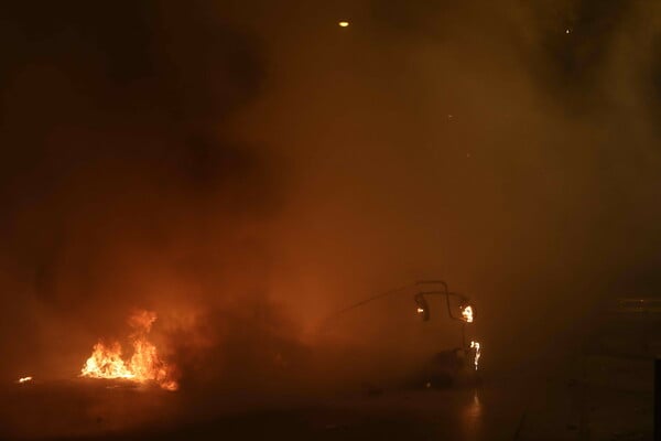 Τα ΜΑΤ έκαναν χρήση χημικών και η ατμόσφαιρα είναι αποπνικτική, ενώ η περιοχή έχει μετατραπεί σε πεδίο μάχης. Ζημιές προκλήθηκαν σε σταθμευμένα οχήματα, ενώ η Πυροσβεστική επιχειρεί για την κατάσβεση των φωτιών, με συνδρομή από το θωρακισμένο όχημα εκτόξευσης νερού (αύρα) της Αστυνομίας που βρίσκεται στο σημείο.