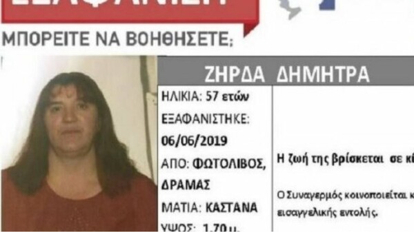 Νεκρή εντοπίστηκε το απόγευμα του Σαββάτου η 57χρονη Δήμητρα Ζήρδα η οποία είχε εξαφανιστεί πριν περίπου δέκα μέρες από το χωριό Φωτολίβος Δράμας, όπου έμενε με τον σύζυγο και τον μικρότερο γιο της.