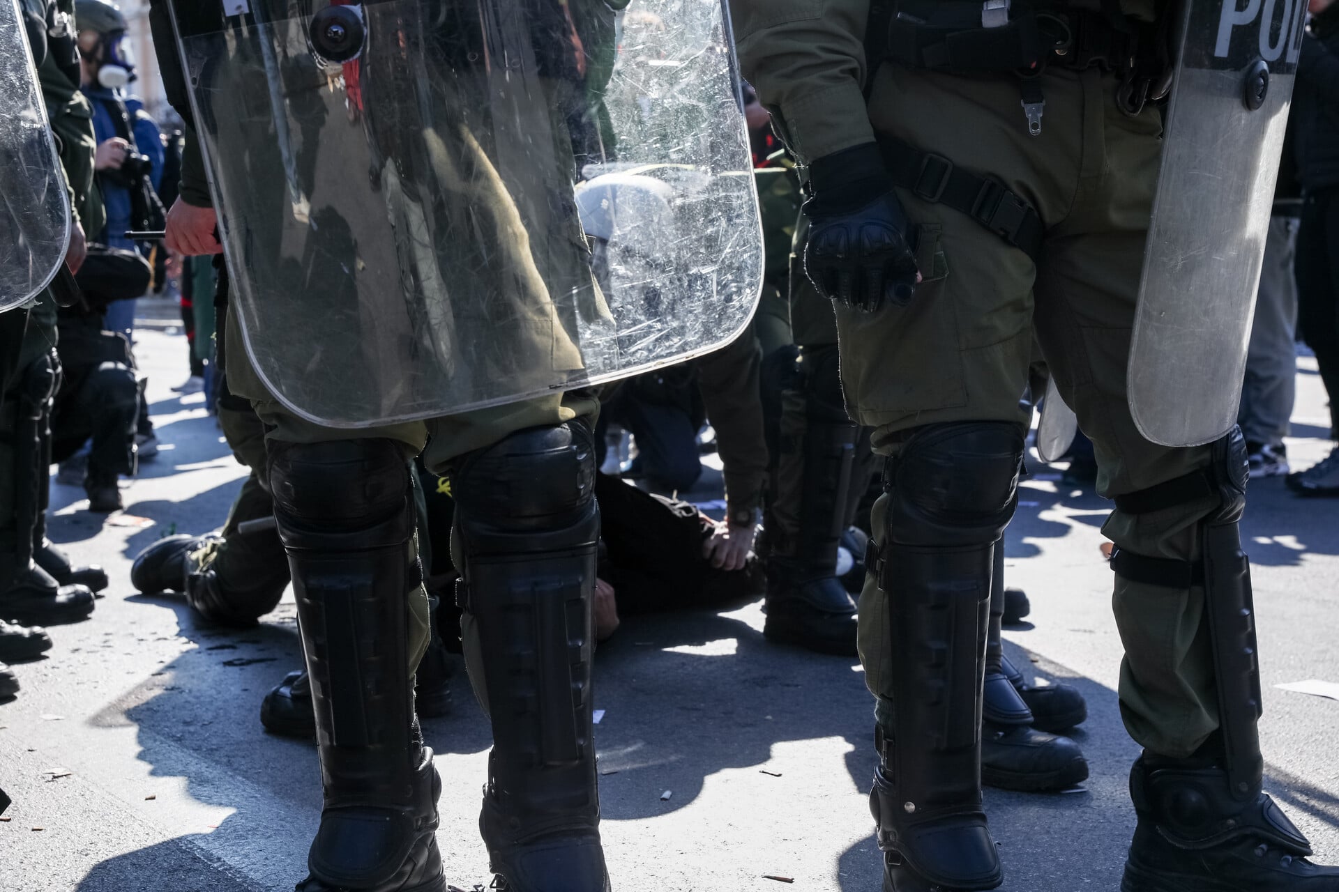Στα πλάνα βλέπουμε έναν αστυνομικό των ΜΑΤ να σπρώχνει βίαια και να κλωτσά μία διαδηλώτρια. Η γυναίκα διακρίνεται να χάνει την ισορροπία της με αποτέλεσμα να πέφτει με το κεφάλι σε τσιμεντένια ζαρντινιέρα.