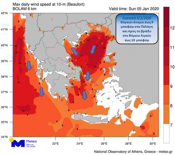 Οι βόρειοι άνεμοι θα ενισχυθούν σταδιακά, πρώτα στο Ιόνιο και στο Θερμαϊκό και στη συνέχεια στο υπόλοιπο Αιγαίο και θα φτάνουν κατά τόπους τα 9 μποφόρ. Προς το βράδυ στο Βόρειο Αιγαίο οι άνεμοι θα φτάνουν τοπικά και τα 10 μποφόρ. Η θερμοκρασία θα παρουσιάσει πτώση από το απόγευμα. Μπορείτε να δείτε τις περιοχές όπου ο άνεμος θα ξεπεράσει τα 7 μποφόρ την Κυριακή 5/1 στο σχετικό χάρτη.