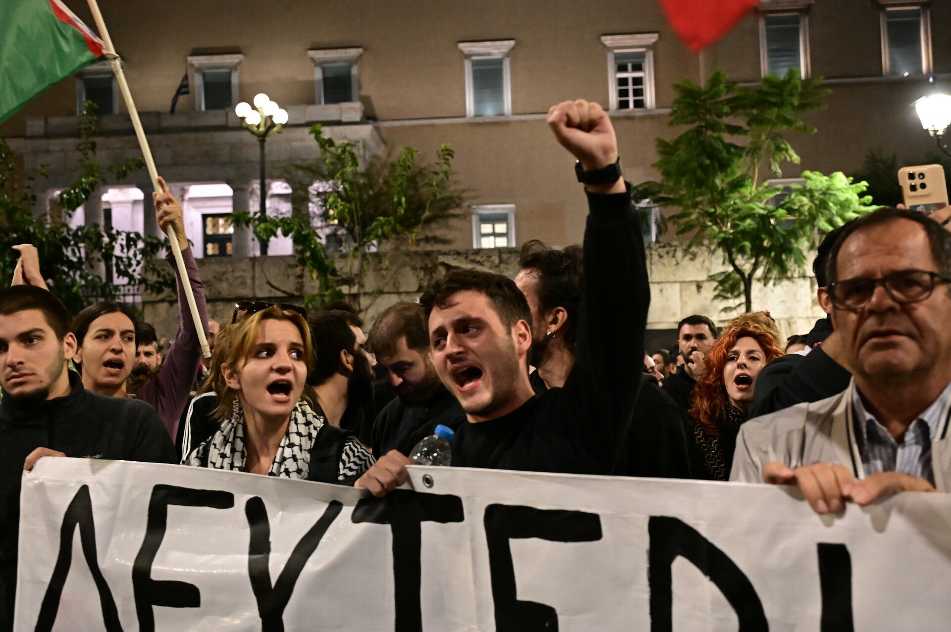 Συγκέντρωση διαμαρτυρίας πραγματοποιήθηκε το βράδυ της Τετάρτης έξω από το Υπουργείο Εξωτερικών στην Αθήνα, με αφορμή την ισραηλινή επιχείρηση κατά του στολίσκου που μετέφερε ανθρωπιστική βοήθεια στη Γάζα.