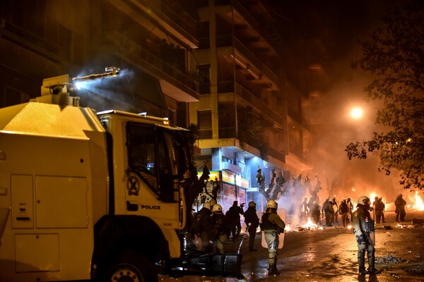 Εικόνες σύρραξης στα Εξάρχεια - Ο Αίαντας διέλυσε οδοφράγματα και ρίχνει νερό
